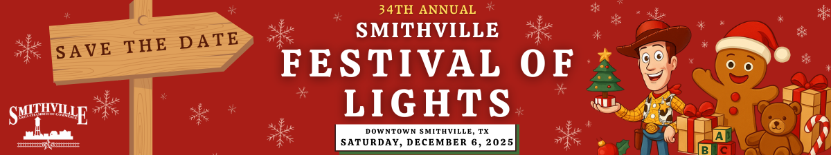 Festival of Lights is a beloved holiday tradition in Smithville, Texas. There will be an Arts & Crafts Festival held from 10AM to 4PM in the gymnasium at the Smithville Recreation Center, along with more vendors and family friendly activities in Railroad Park & downtown (intersection of Main Street & 1st Street)