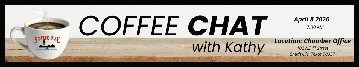 This Coffee Chat is open to Chamber members and non-members—we’d love to have you join us! Join us at the Chamber Office located at 102 NE 1st Street, Smithville, Texas 78957!