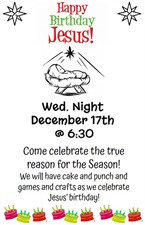 We will have cake, punch, games & crafts as we celebrate Jesus' birthday!