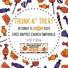 Smithville Area Chamber of Commerce Trunk N' Treat by First Baptist Church FBC Trunk N' Treat Trunk N' Treat by First Baptist Churc... Set a Reminder Enter your email address below to receive a reminder message. Email address Select the amount of Days before the event -- Select Days Before Event -- 1 Day 2 Days 3 Days 1 Week Captcha Validation Please complete the Captcha Submit Date and Time Friday Oct 31, 2025 5:30 PM - 7:30 PM CDT Friday, October 31st 5:30pm- 7:30pm Location First Baptist Church Smithville Fees/Admission Free Set a Reminder Enter your email address below to receive a reminder message. Email address Select the amount of Days before the event -- Select Days Before Event -- 1 Day 2 Days 3 Days 1 Week Captcha Validation Please complete the Captcha Submit Share × Print Email Add to Calendar Facebook Twitter LinkedIn Tell a Friend × Select Calendar Type × Google Yahoo iCal (Outlook, Apple, or other)